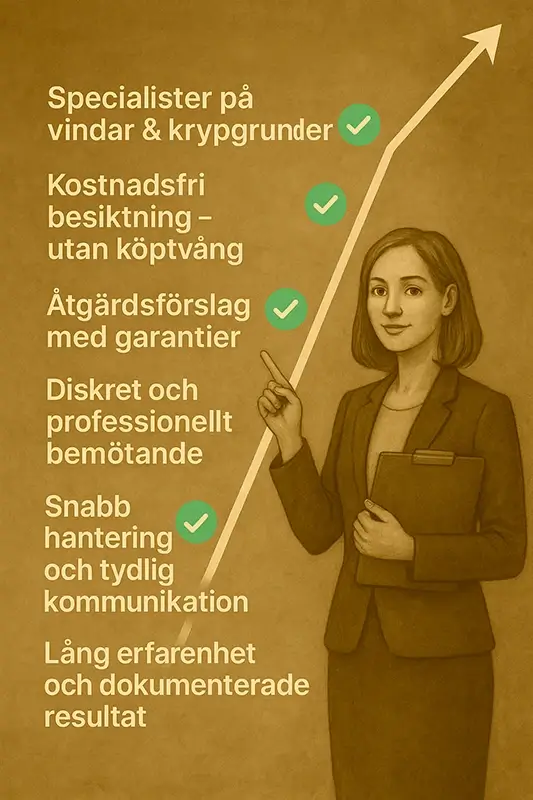 Fukt- och mögelproblem kan snabbt leda till höga kostnader och värdeminskning. Genom tidig upptäckt och åtgärd skyddar ni både investering och inomhusmiljö - och slipper kostsamma renoveringar.
